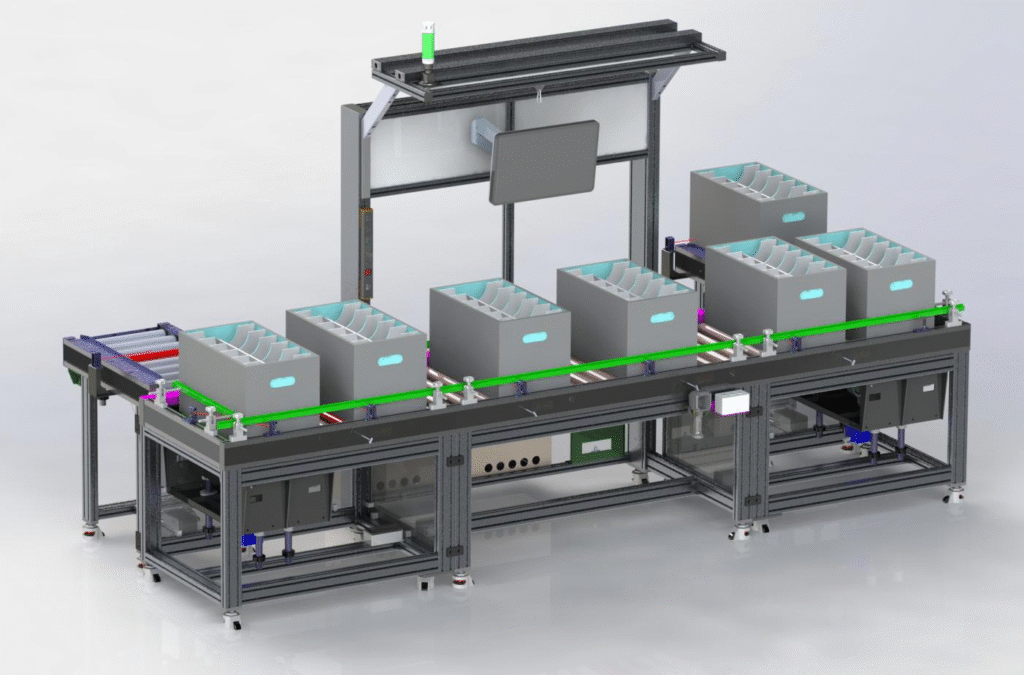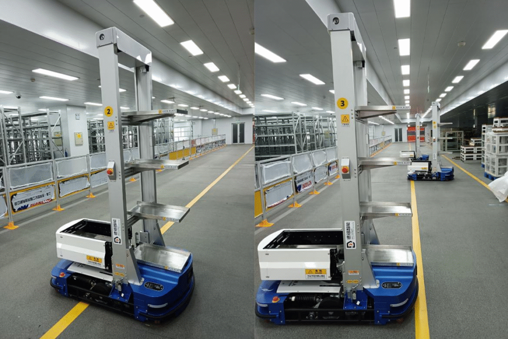 2 .出库功能:在操作系统中选择出库作业,AGV将对应订单物料送至操作台,将料箱按顺序放入出库输送线工作站,作业员按系统与电子标签提示拣选物料