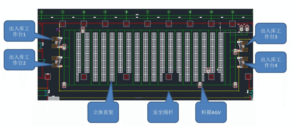 1 .入库功能:操作员将待入库物料送至操作台,并在操作系统中选择入库作业,将料箱放至入库输送线,呼叫AGV至操作台,AGV从输送线出库口搬出料箱,将货物送至对应存储货位。